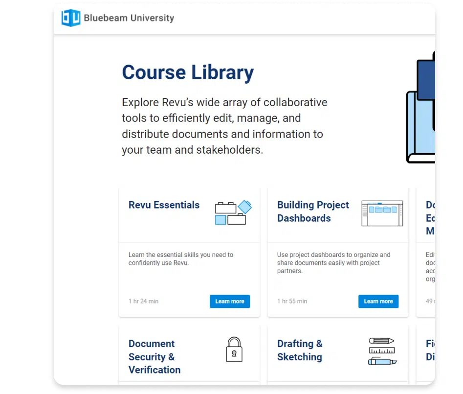 Para assinantes, oferecemos acesso à Bluebeam University (BBU), nosso programa de treinamento online autoguiado que ajuda as equipes a aprenderem os recursos e fluxos de trabalho essenciais do Bluebeam no seu próprio ritmo. Os cursos da BBU incluem vídeos passo a passo, exercícios interativos e questionários elaborados para que as equipes se familiarizem com a plataforma em horas, em vez de meses.
