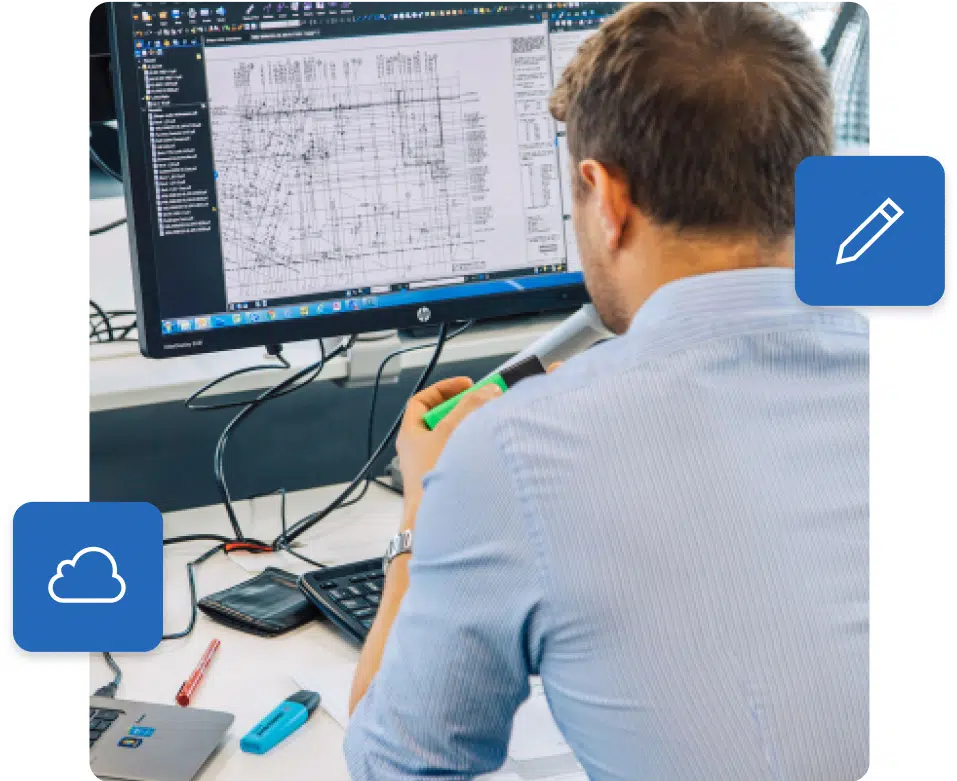 O software Bluebeam para o setor público permite que as equipes criem, marquem e revisem documentos simultaneamente, independentemente de sua localização ou dispositivo. Além disso, centraliza com segurança todos os ativos do projeto na nuvem, garantindo uma única fonte de informações confiáveis.